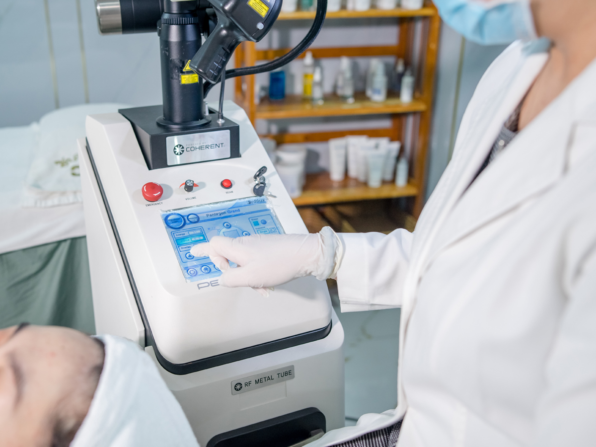 Điều trị bằng Laser CO2 Fractional: Là kỹ thuật sử dụng laser CO2, có bước sóng 10.600nm, được hấp thu mạnh bởi nước, từ đó sinh nhiệt cao, làm bốc hơi tổ chức mô cần tác động hoặc tạo các điểm tổn thương vi nhiệt xen kẽ vùng da lành nhằm kích hoạt quá trình tái tạo da, làm tăng số lượng và chất lượng collagen, elastin trong da, từ đó làm đầy vết lõm của da.